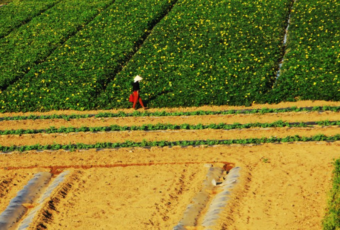 | Cánh đồng mướp giữa sông Ba. Đi trên cầu Đà Rằng có thể nhìn xuống thấy được những luống dưa, luống mướp trồng giữa bãi phù sa - - Ảnh: Dương Thanh Xuân |