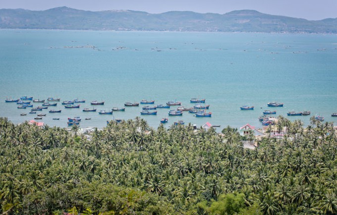 Đứng từ dốc Găng nằm trên quốc lộ 1 thuộc thị xã Sông Cầu (Phú Yên), bạn có thể thấy rõ toàn cảnh vịnh Xuân Đài với rừng dừa và vòng cung núi bao bọc khu vực bờ vịnh. Vịnh Xuân Đài là một trong những vịnh có tiềm năng du lịch lớn nhất nhì miền Trung với cảnh sắc hữu tình, có nhiều đảo, bãi tắm đẹp và hoang sơ - Ảnh: Tiến Thành